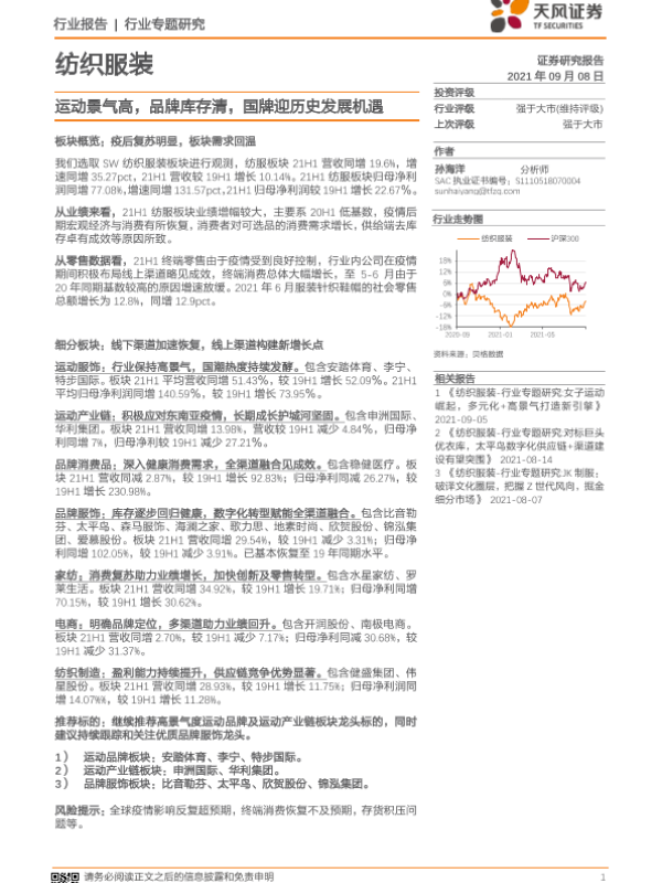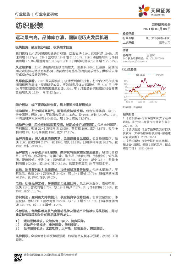 【天风证券】【20210908】纺织服装行业:运动景气高,品牌库存清,国牌迎历史发展机遇-23页