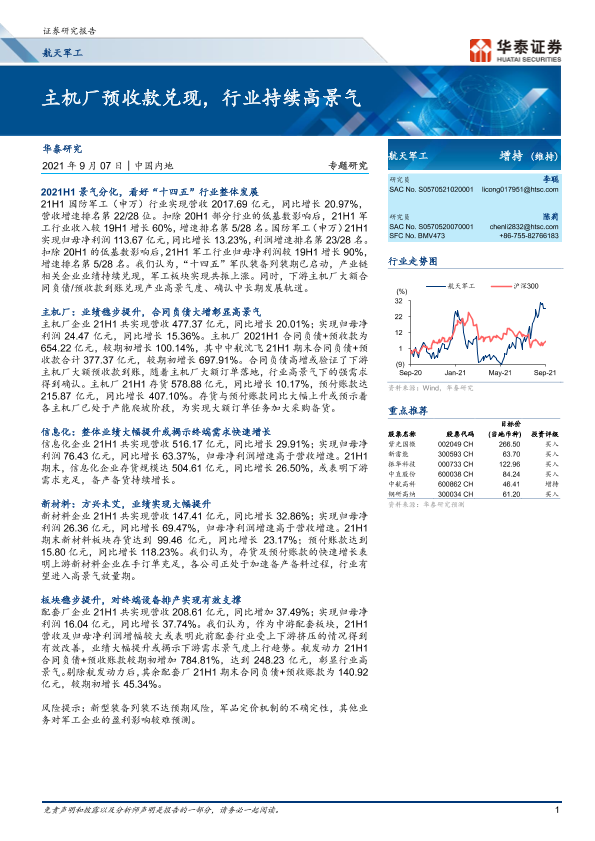 【华泰证券】【20210907】航天军工行业:主机厂预收款兑现,行业持续高景气-22页