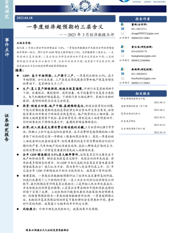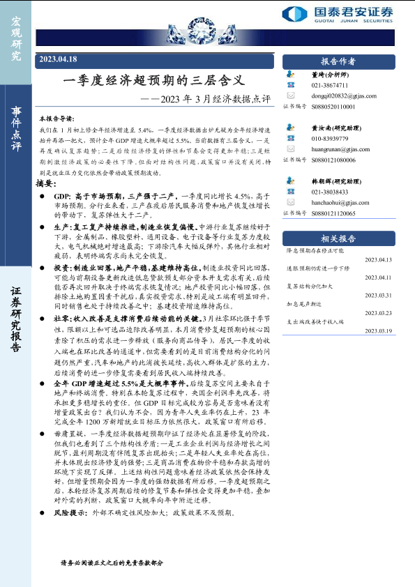 【国泰君安证券】【20230418】2023年3月经济数据点评:一季度经济超预期的三层含义-17页