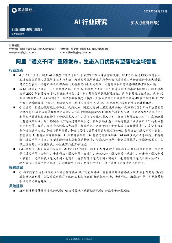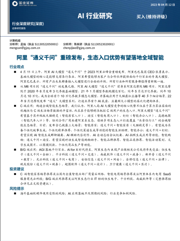 【国金证券】【20230412】AI行业研究:阿里“通义千问”重磅发布,生态入口优势有望落地全域智能-25页