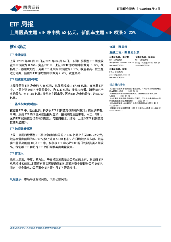 【国信证券】【20230416】ETF周报:上周医药主题ETF净申购63亿元,新能车主题ETF领涨2.22%-22页