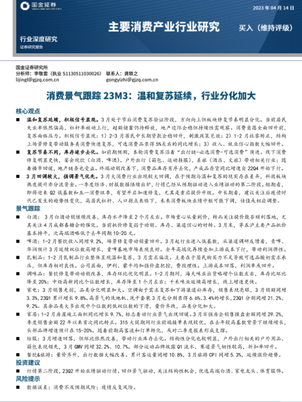 【国金证券】【20230414】主要消费产业行业研究:消费景气跟踪23M3,温和复苏延续,行业分化加大-26页