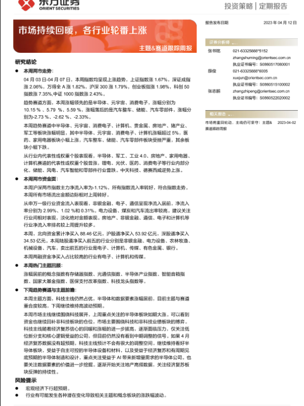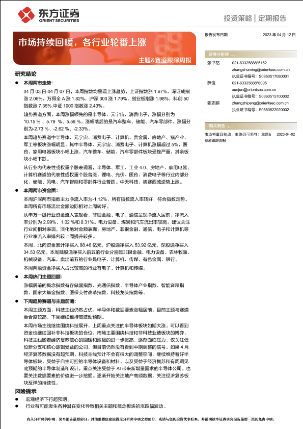 【东方证券】【20230412】主题&赛道跟踪周报:市场持续回暖,各行业轮番上涨-15页
