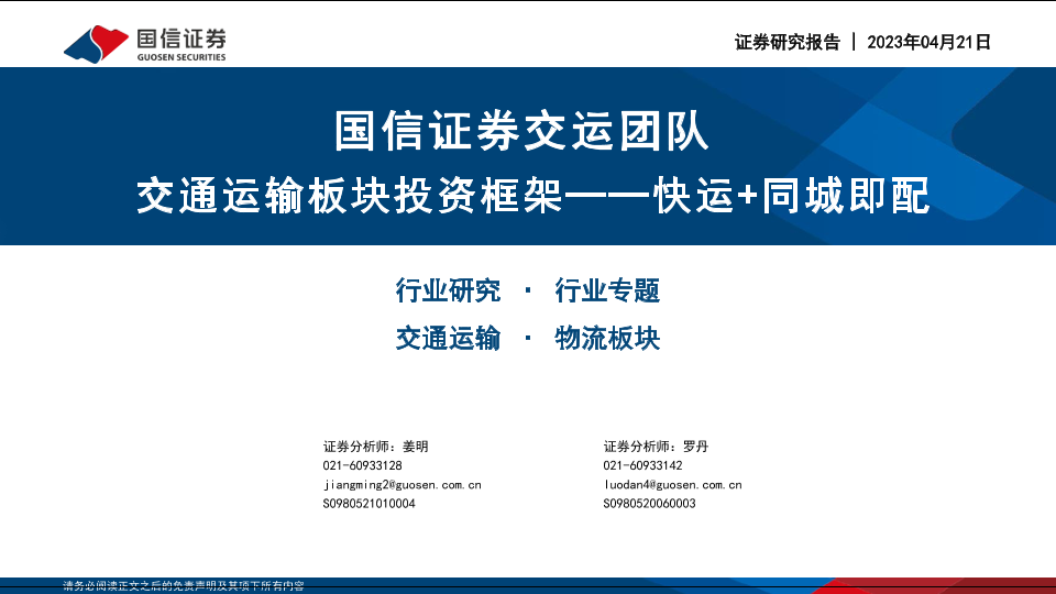 【国信证券】【20230421】交通运输行业板块投资框架系列:快运+同城即配-25页