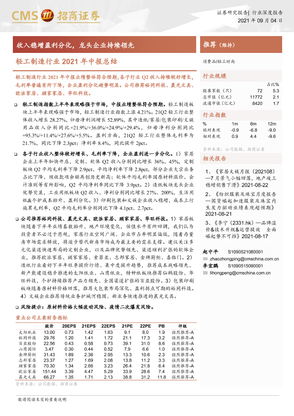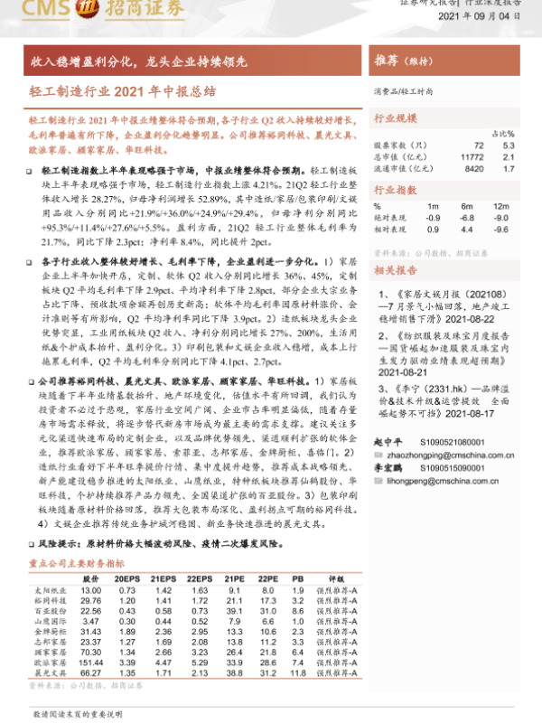 【海通证券】【20210904】轻工制造行业2021年中报总结:收入稳增盈利分化,龙头企业持续领先-22页