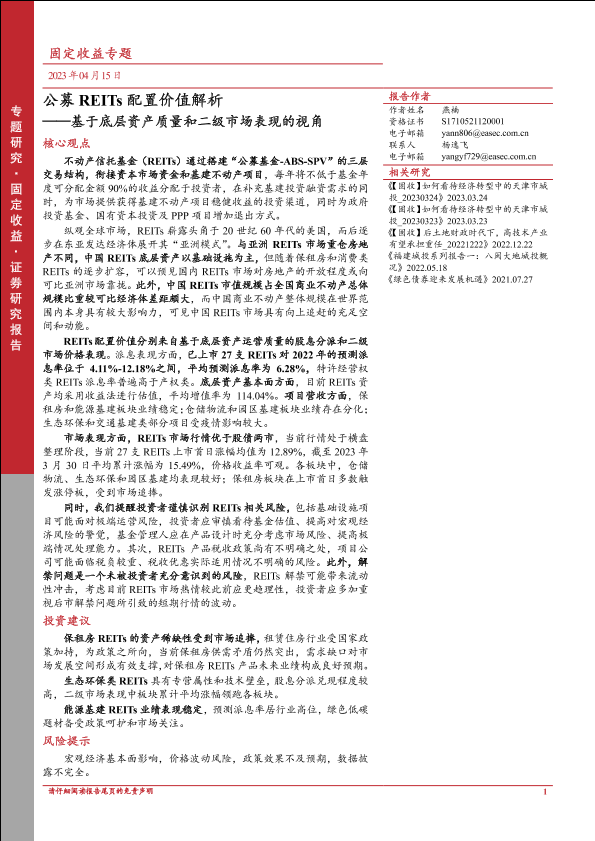 【东亚前海证券】【20230415】公募REITs配置价值解析:基于底层资产质量和二级市场表现的视角-28页