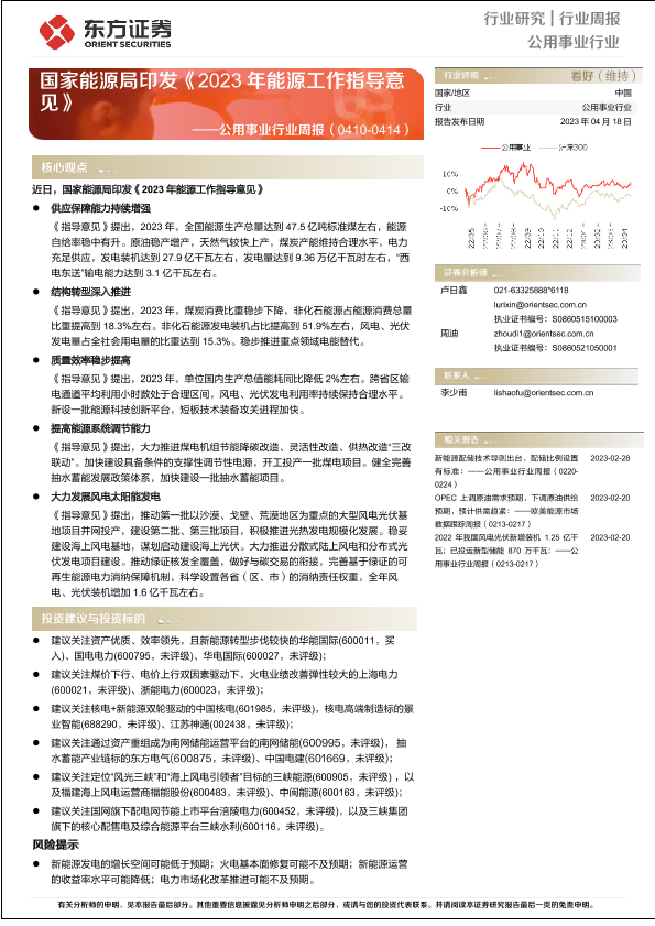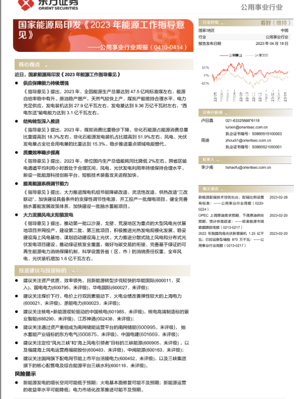 【东方证券】【20230418】公用事业行业周报:国家能源局印发《2023年能源工作指导意见》-16页