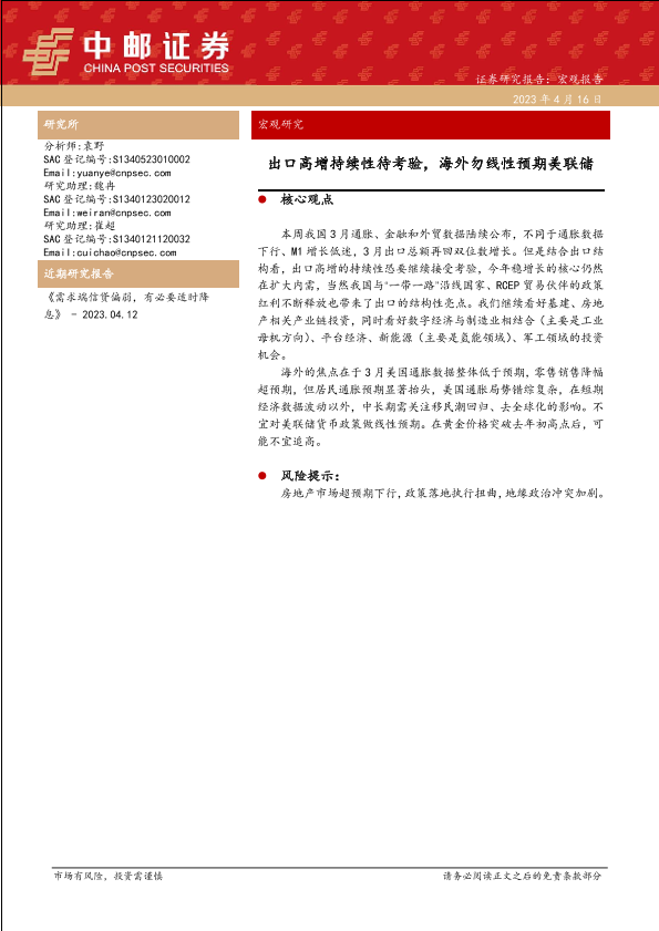 【中邮证券】【20230416】出口高增持续性待考验,海外勿线性预期美联储-18页