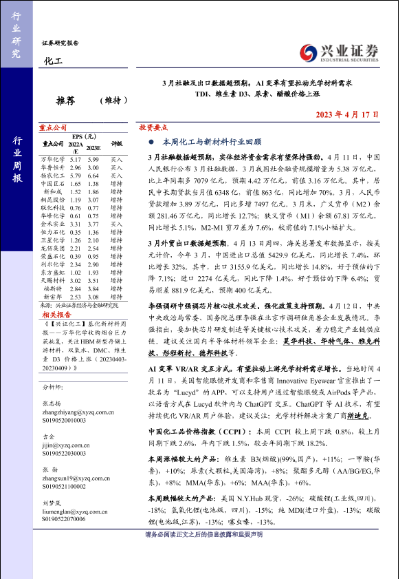 【兴业证券】【20230417】化工行业周报:3月社融及出口数据超预期,AI变革有望拉动光学材料需求 TDI、维生素D3、尿素、醋酸价格上涨-46页