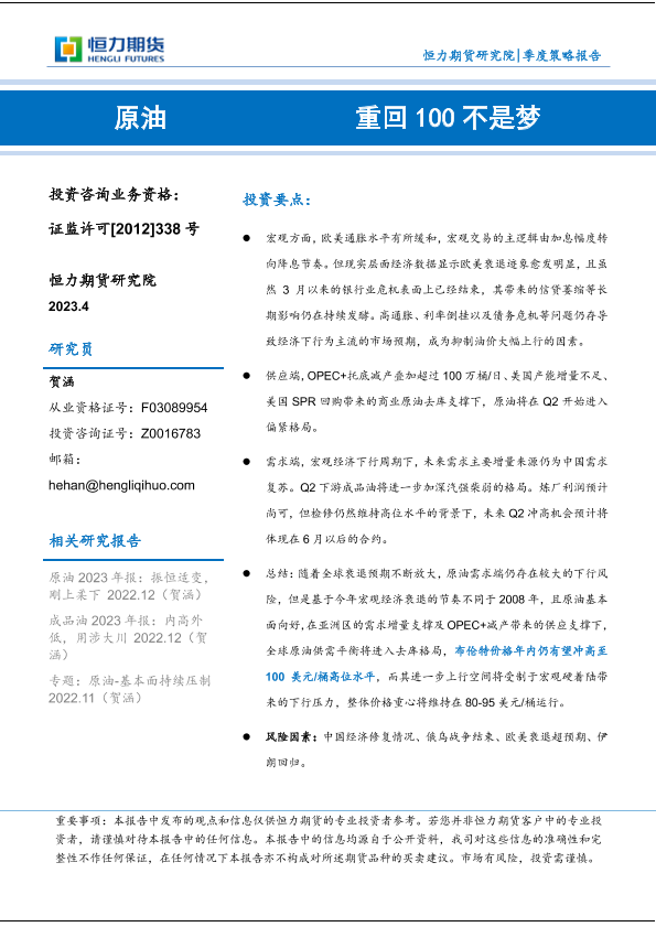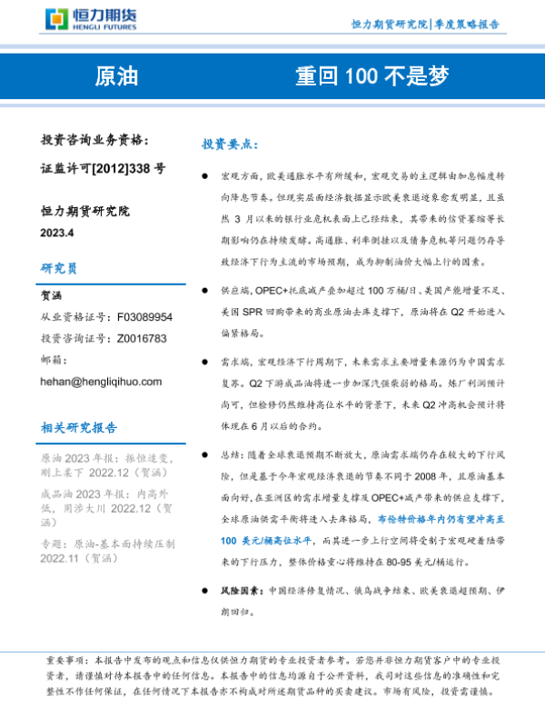 【恒力期货】【20230421】原油季度策略报告:重回100不是梦-23页