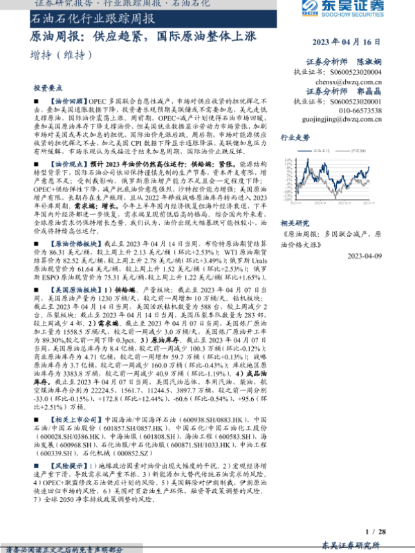 【东吴证券】【20230416】原油周报:供应趋紧,国际原油整体上涨-28页