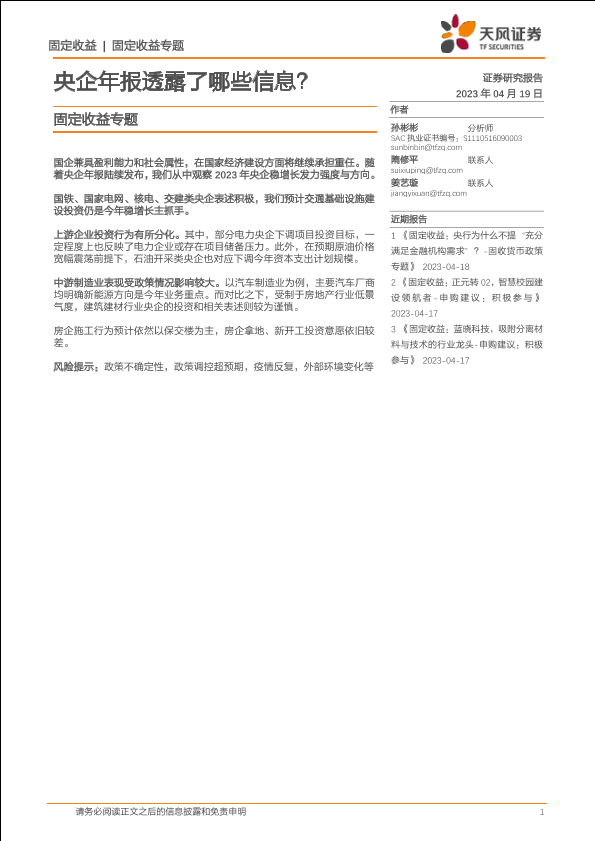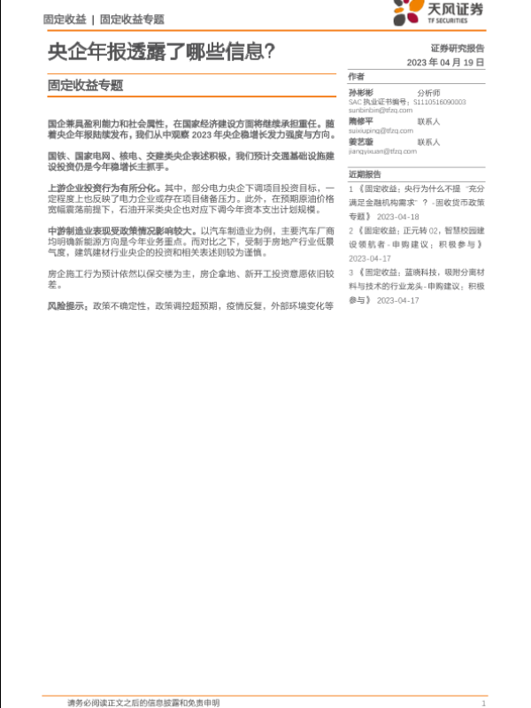 【天风证券】【20230419】固定收益专题:央企年报透露了哪些信息?-15页