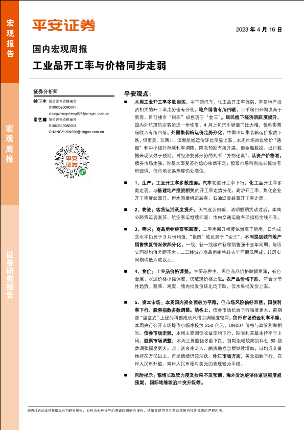 【平安证券】【20230416】国内宏观周报:工业品开工率与价格同步走弱-15页