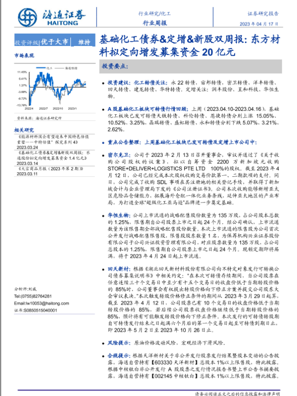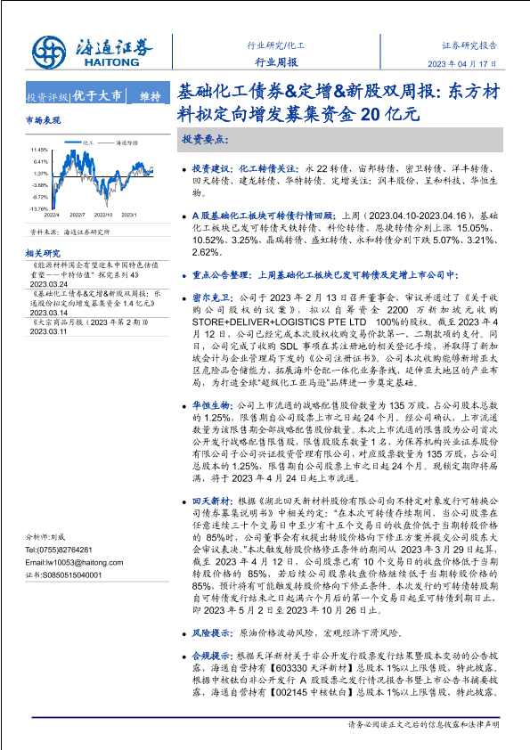 【海通证券】【20230417】基础化工债券&定增&新股双周报:东方材料拟定向增发募集资金20亿元-17页