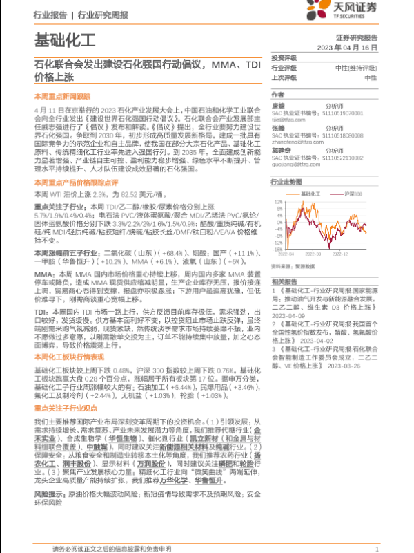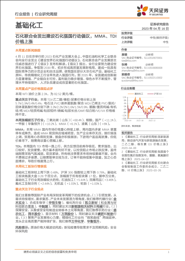 【天风证券】【20230416】基础化工行业研究周报:石化联合会发出建设石化强国行动倡议,MMA、TDI价格上涨-19页