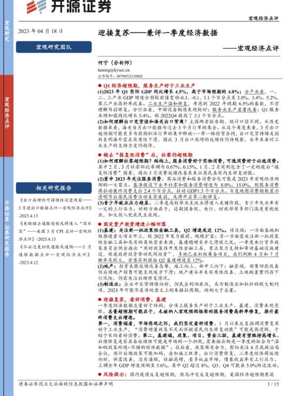 【开源证券】【20230418】宏观经济点评:兼评一季度经济数据,迎接复苏-15页
