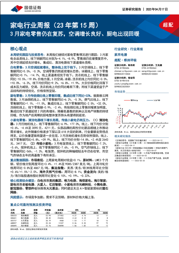 【国信证券】【20230417】家电行业周报(23年第15周):3月家电零售仍在复苏,空调增长良好、厨电出现回暖-17页
