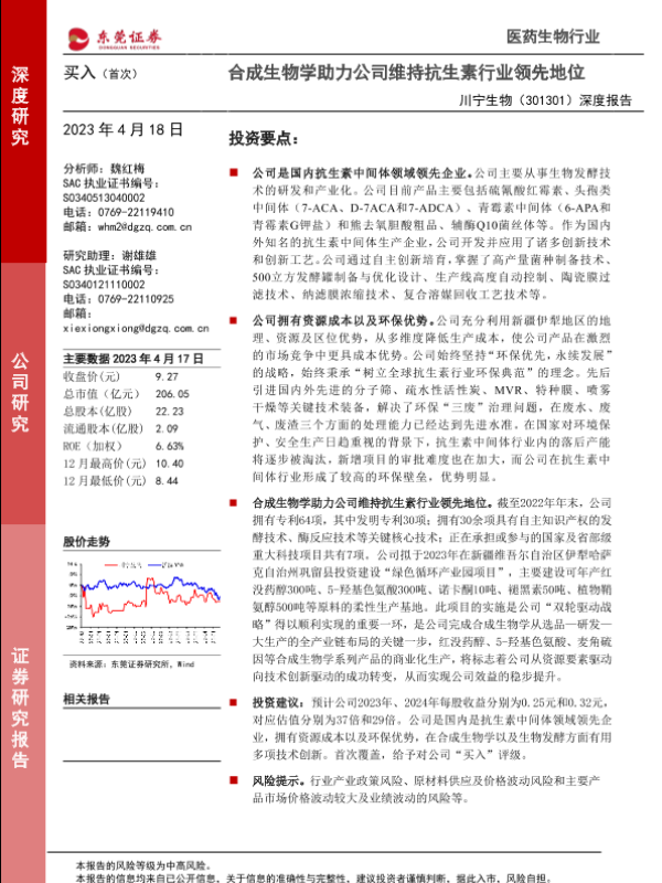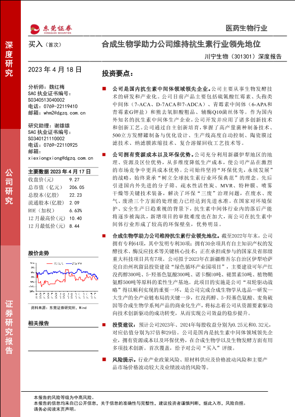 【东莞证券】【20230418】川宁生物301301.SZ深度报告:合成生物学助力公司维持抗生素行业领先地位-26页