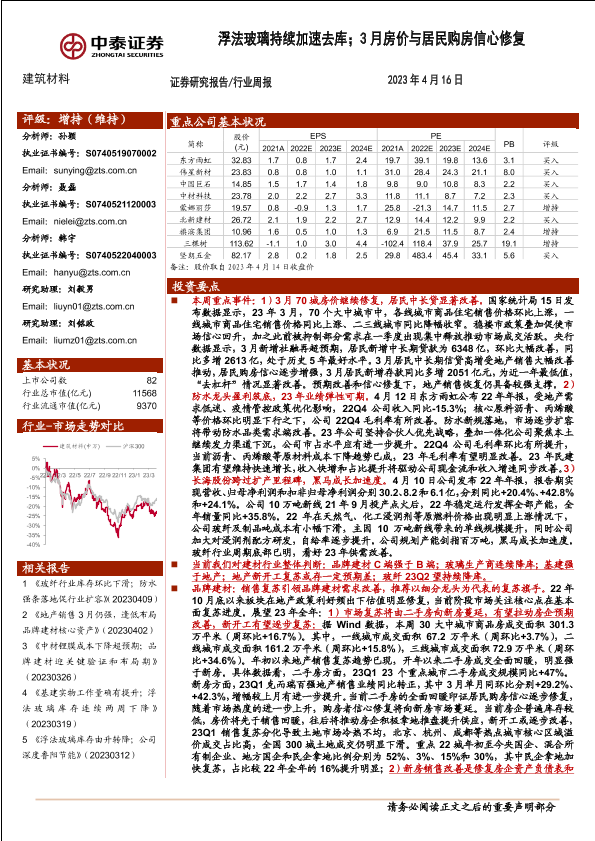 【中泰证券】【20230416】建筑材料行业周报:浮法玻璃持续加速去库;3月房价与居民购房信心修复-24页