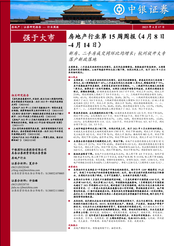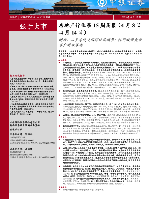 【中银证券】【20230417】房地产行业第15周周报:新房、二手房成交同环比均增长;杭州放开大专落户新政落地-32页