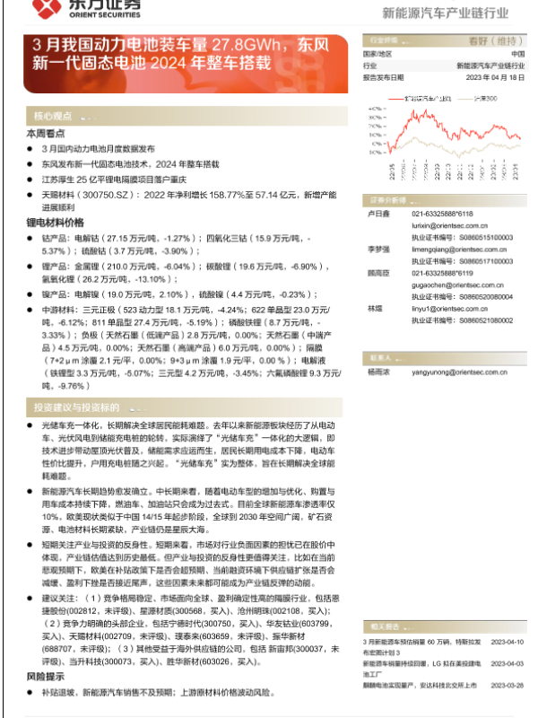 【东方证券】【20230418】新能源汽车产业链行业周报:3月我国动力电池装车量27.8GWh,东风新一代固态电池2024年整车搭载-15页