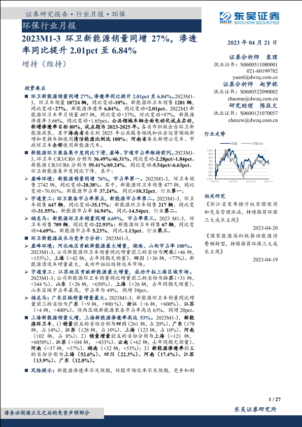 【东吴证券】【20230421】环保行业月报:2023M1-3环卫新能源销量同增27%,渗透率同比提升2.01pct至6.84%-27页