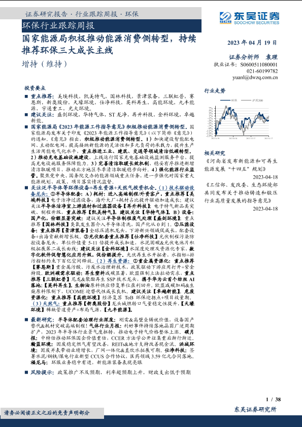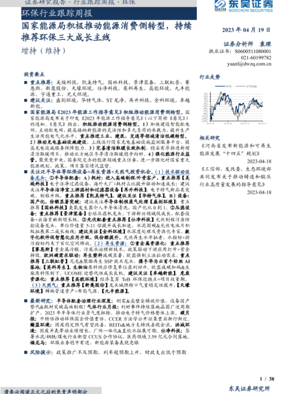 【东吴证券】【20230419】环保行业跟踪周报:国家能源局积极推动能源消费侧转型,持续推荐环保三大成长主线-38页