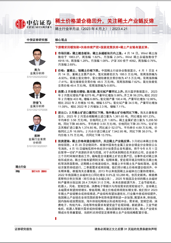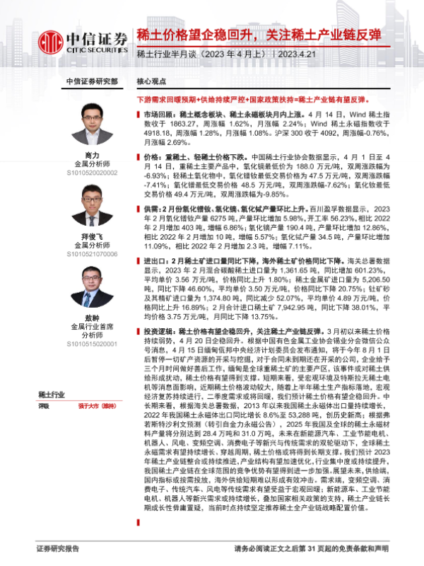【中信证券】【20230421】稀土行业半月谈(2023年4月上):稀土价格望企稳回升,关注稀土产业链反弹-32页