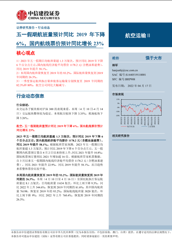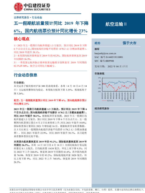 【中信建投证券】【20230417】航空运输行业:五一假期航班量预计同比2019年下降6%,国内航线票价预计同比增长23%-25页
