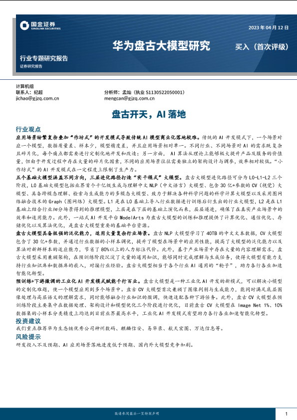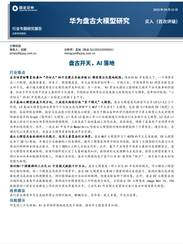 【国金证券】【20230412】计算机行业专题研究报告:华为盘古大模型研究,盘古开天,AI落地-37页