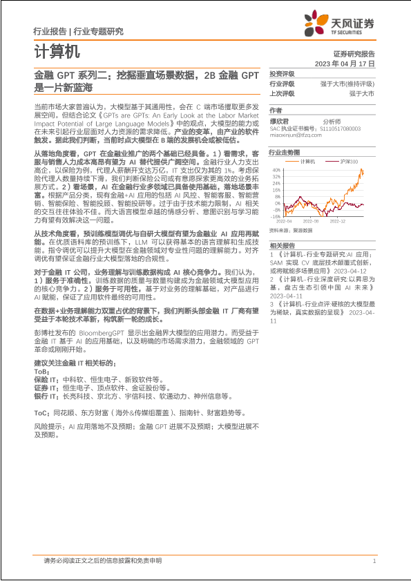 【天风证券】【20230417】计算机金融GPT系列二:挖掘垂直场景数据,2B金融GPT是一片新蓝海-14页