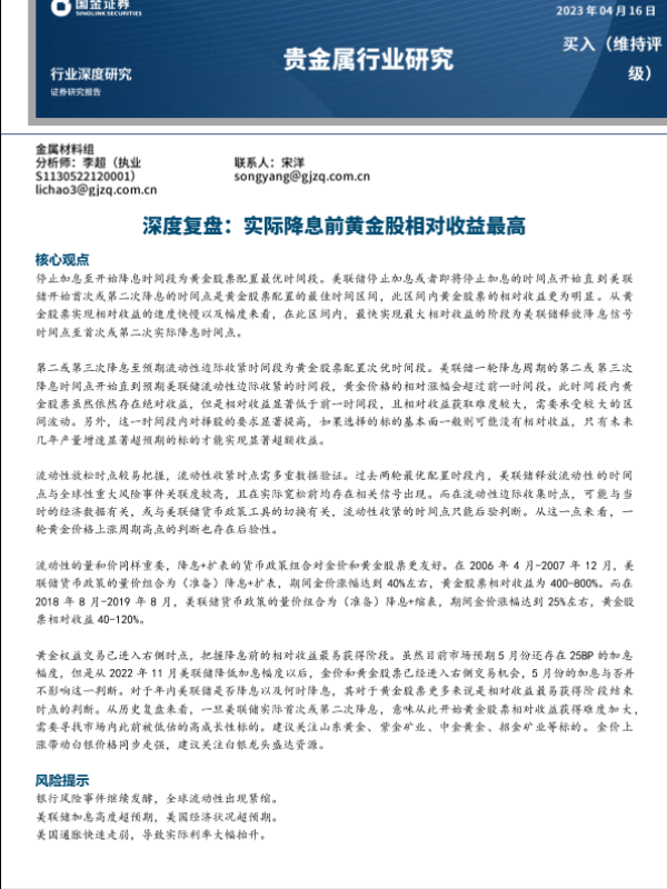 【国金证券】【20230416】贵金属行业研究:深度复盘:实际降息前黄金股相对收益最高-18页