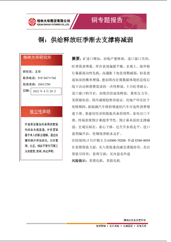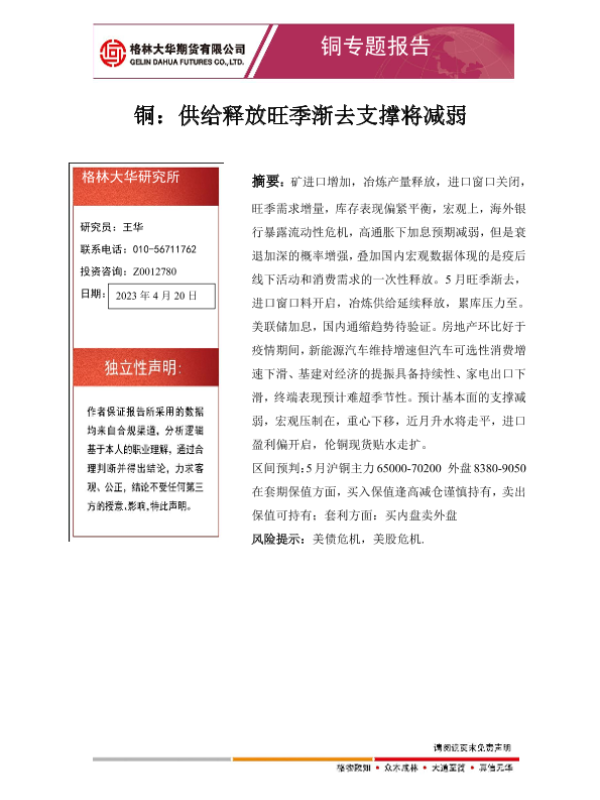 【格林大华期货】【20230420】铜专题报告:供给释放旺季渐去支撑将减弱-16页