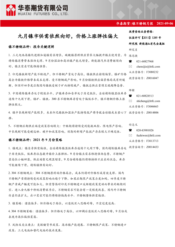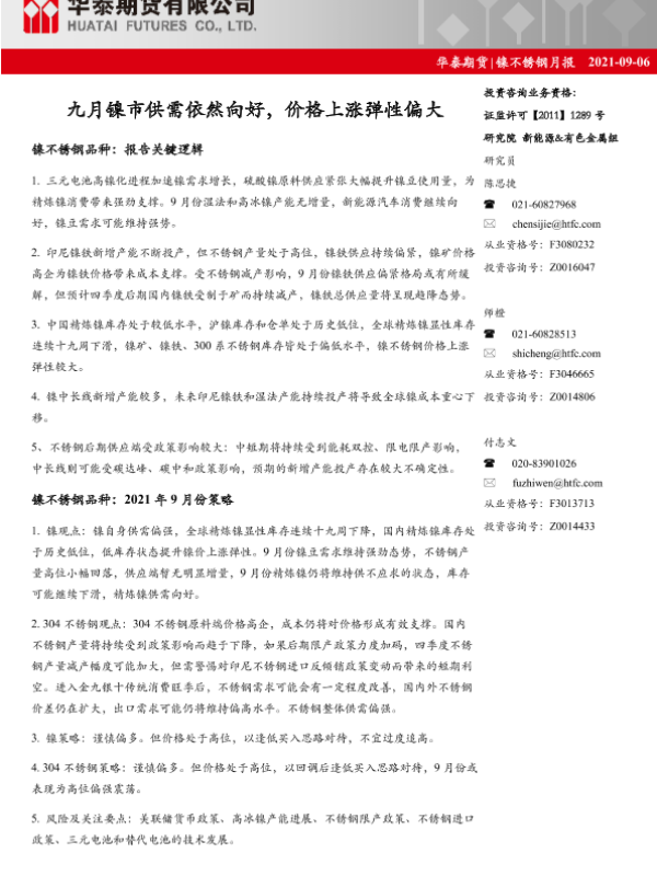 【华泰期货】【20210906】镍不锈钢月报:九月镍市供需依然向好,价格上涨弹性偏大-22页