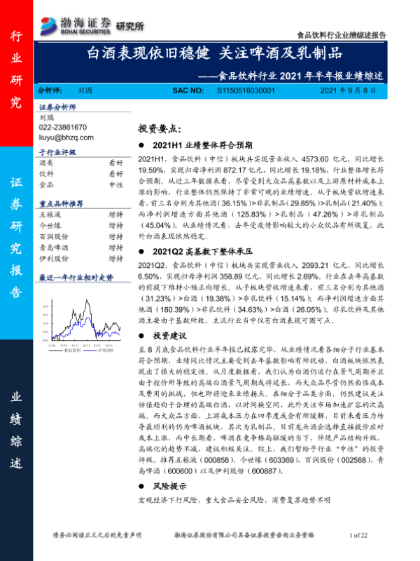 【渤海证券】【20210908】食品饮料行业2021年半年报业绩综述:白酒表现依旧稳健,关注啤酒及乳制品-22页