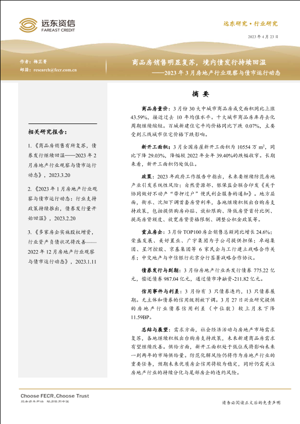 【远东咨询】【20230423】2023年3月房地产行业观察与债市运行动态:商品房销售明显复苏,境内债发行持续回温-24页