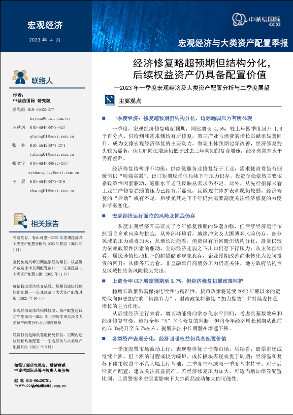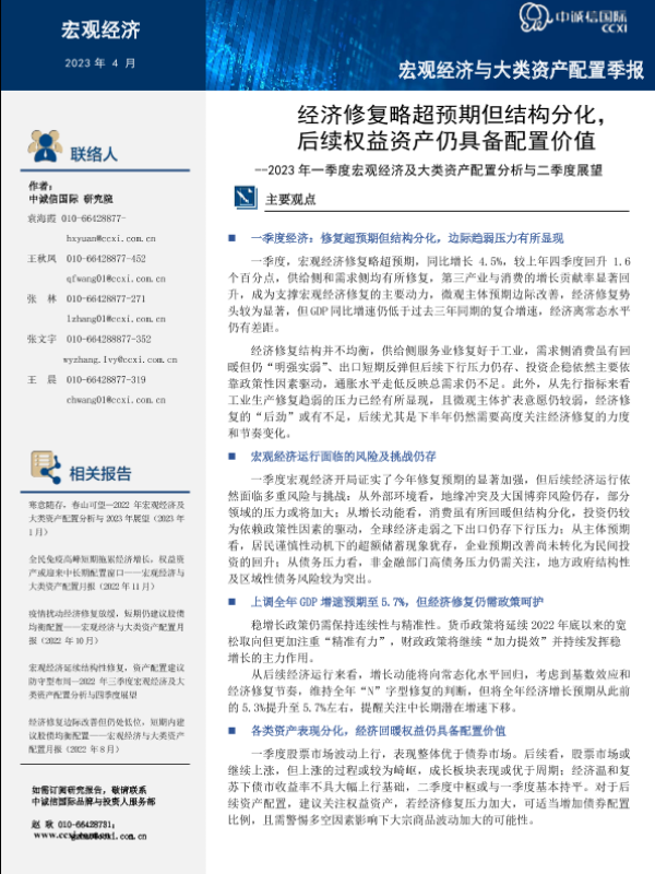 【中诚信国际】【20230423】2023年一季度宏观经济及大类资产配置分析与二季度展望:经济修复略超预期但结构分化,后续权益资产仍具备配置价值-24页