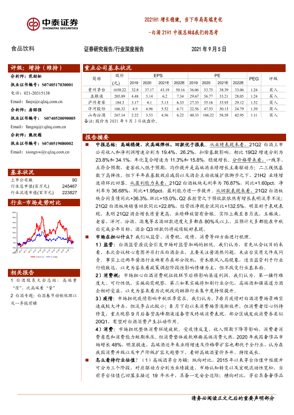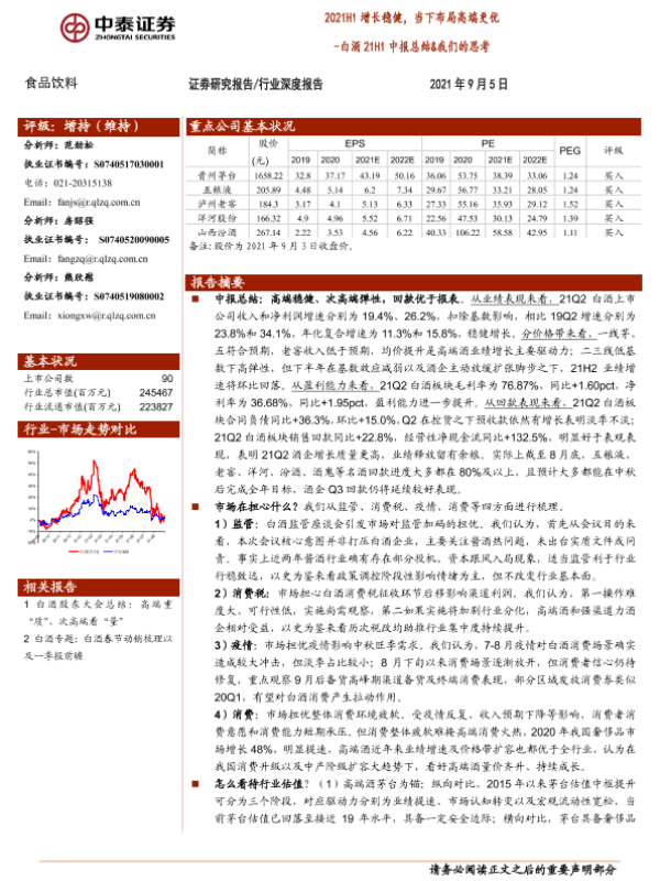 【中泰证券】【20210905】食品饮料行业白酒21H1中报总结&我们的思考:2021H1增长稳健,当下布局高端更优-25页