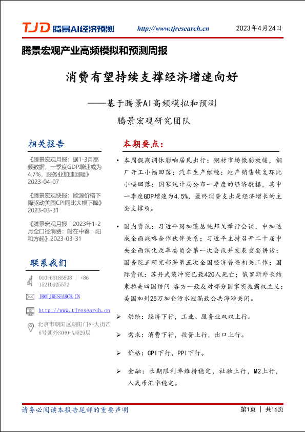 【腾景数研】【20230424】基于腾景AI高频模拟和预测:消费有望持续支撑经济增速向好-16页