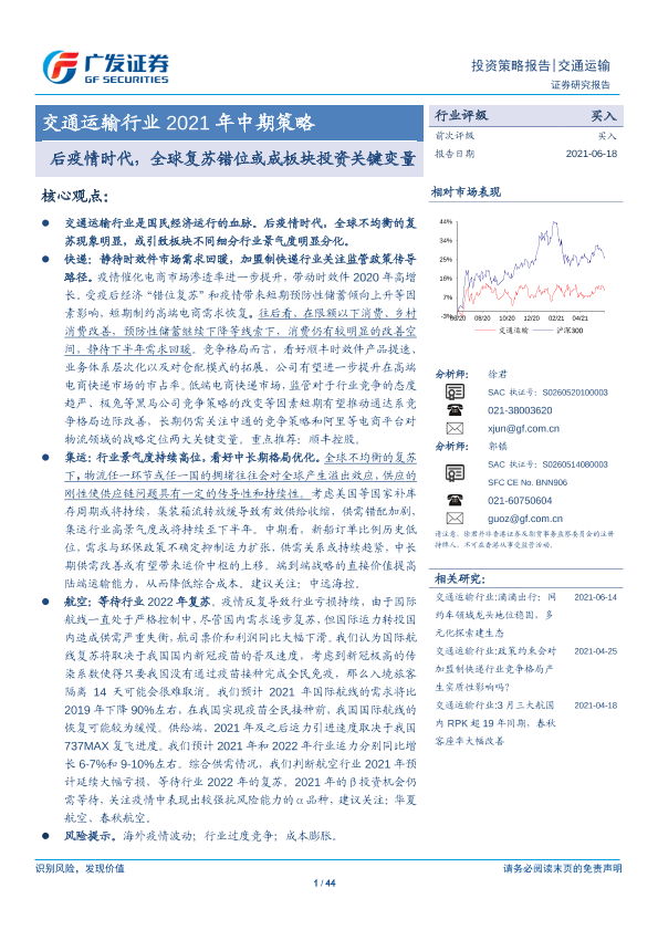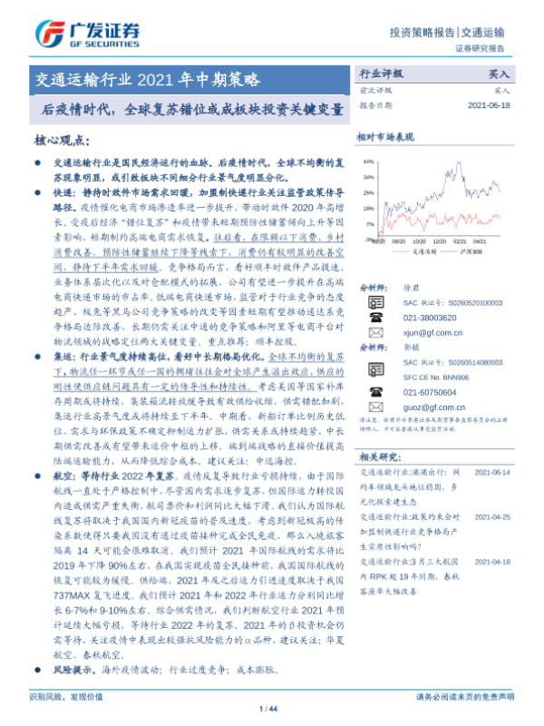 【广发证券】【20210618】交通运输行业2021年中期策略:后疫情时代,全球复苏错位或成板块投资关键变量-44页