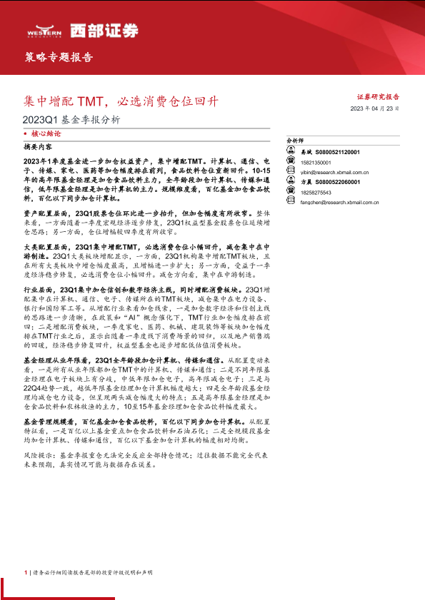 【西部证券】【20230423】2023Q1基金季报分析:集中增配TMT,必选消费仓位回升-15页