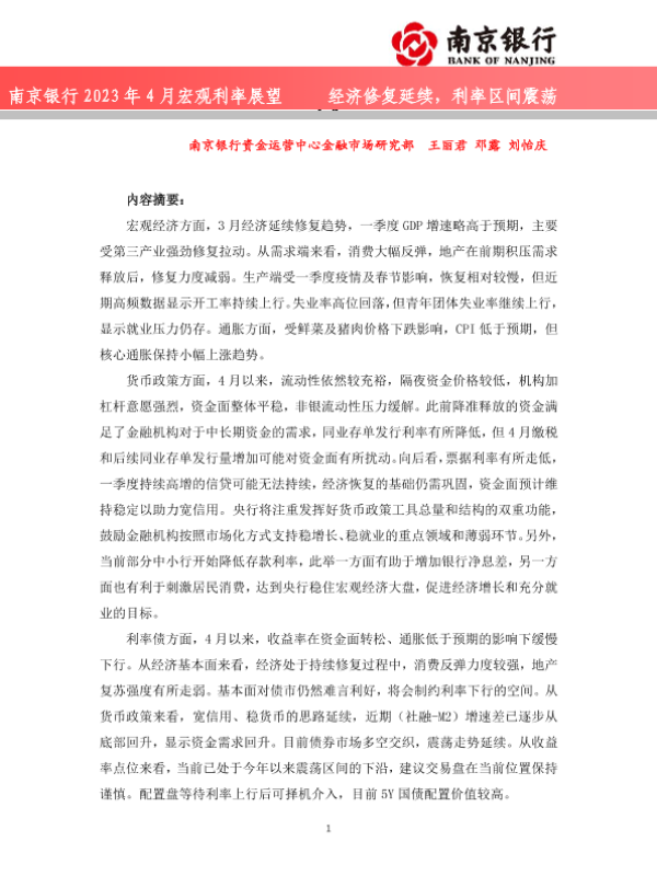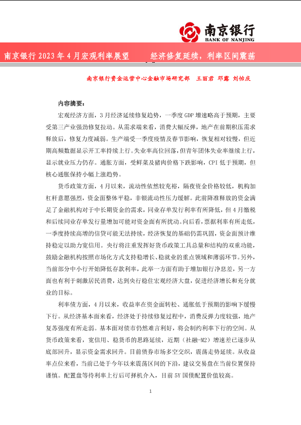 【南京银行】【20230424】2023年4月宏观利率展望:经济修复延续,利率区间震荡-30页