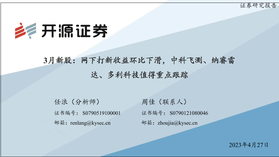 【开源证券】【20230427】3月新股:网下打新收益环比下滑,中科飞测、纳睿雷达、多利科技值得重点跟踪-31页