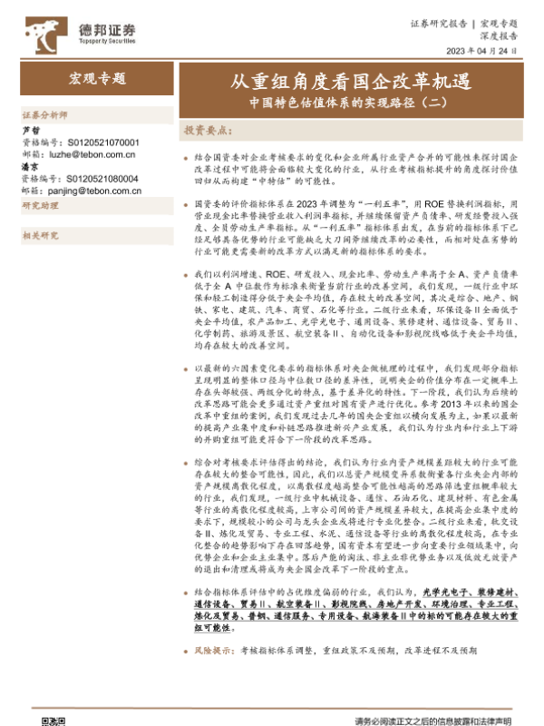 中国特色估值体系 考核指标 行业分析 资产重组 国企改革