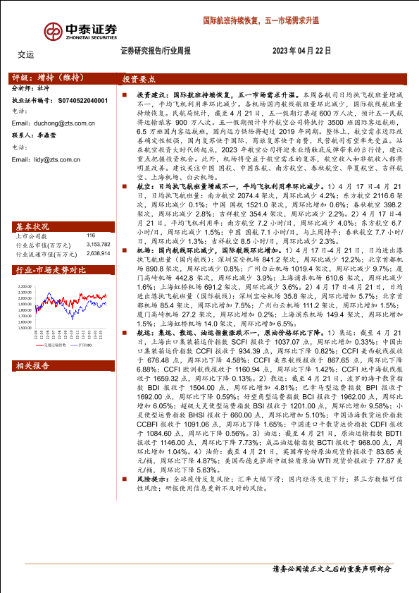 【中泰证券】【20230422】交运行业周报:国际航班持续恢复,五一市场需求升温-36页