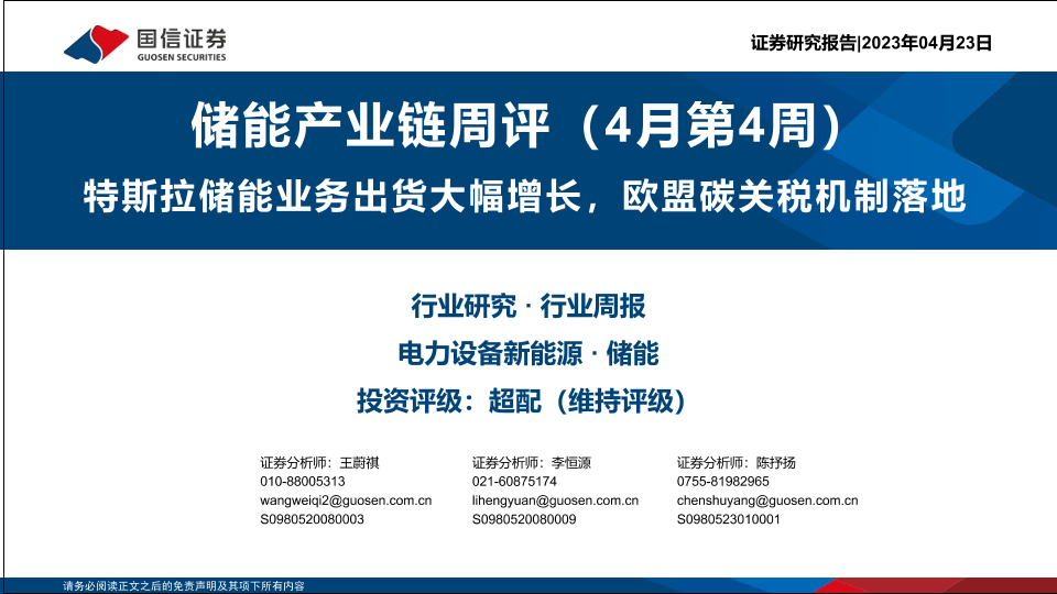 【国信证券】【20230423】储能产业链周评(4月第4周):特斯拉储能业务出货大幅增长,欧盟碳关税机制落地-31页