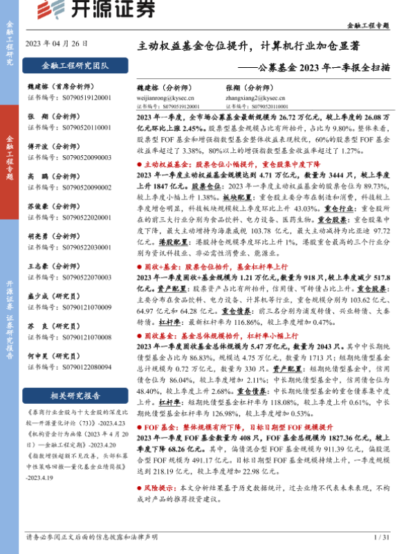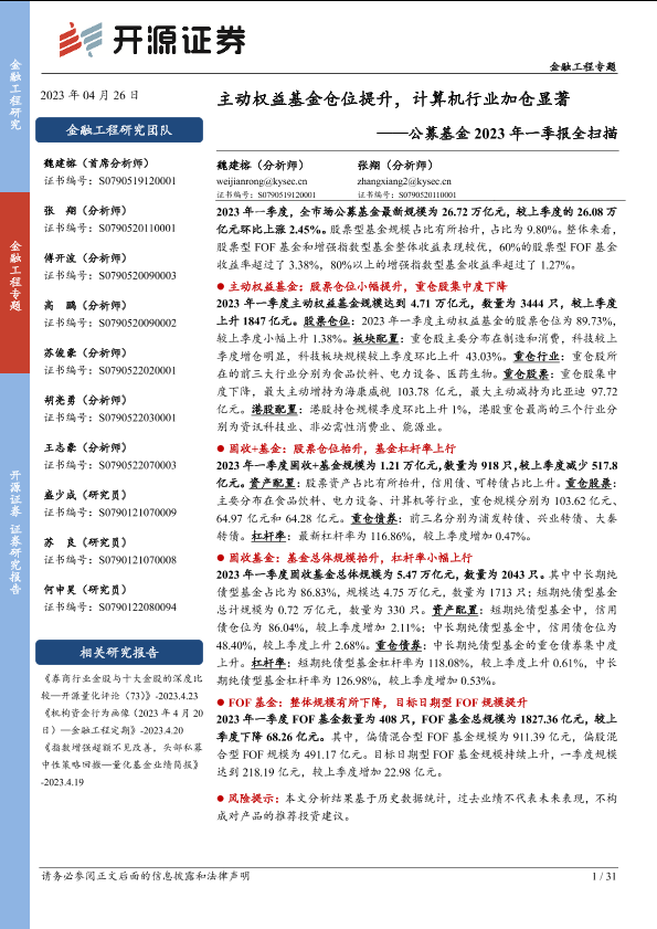 【开源证券】【20230426】公募基金2023年一季报全扫描:主动权益基金仓位提升,计算机行业加仓显著-31页