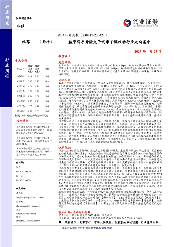 【兴业证券】【20230423】兴证非银周报(230417-230421):监管引导寿险定价利率下调推动行业走向集中-17页