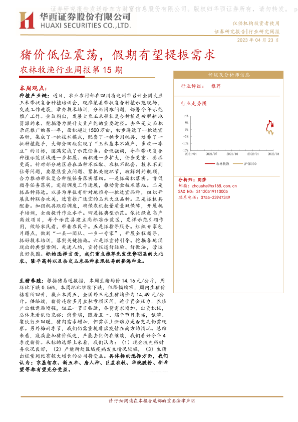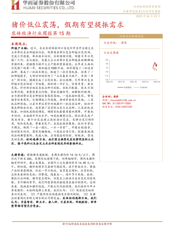 【华西证券】【20230423】农林牧渔行业周报第15期:猪价低位震荡,假期有望提振需求-25页