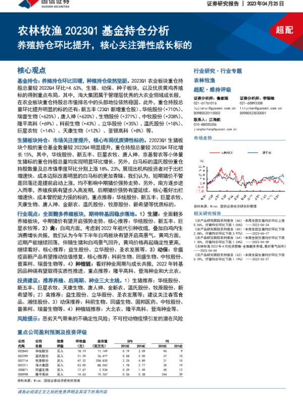 【国信证券】【20230425】农林牧渔行业2023Q1基金持仓分析:养殖持仓环比提升,核心关注弹性成长标的-26页